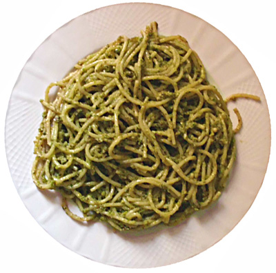 You serve this with spaghetti – other pasts shapes are not allowed! – and garnish it with lots of shredded fresh basil and mint leaves, and a little grated cheese if you wish. Do not heat up the pesto, just spoon it on as it is and stir thoroughly so it coats all the spaghetti.