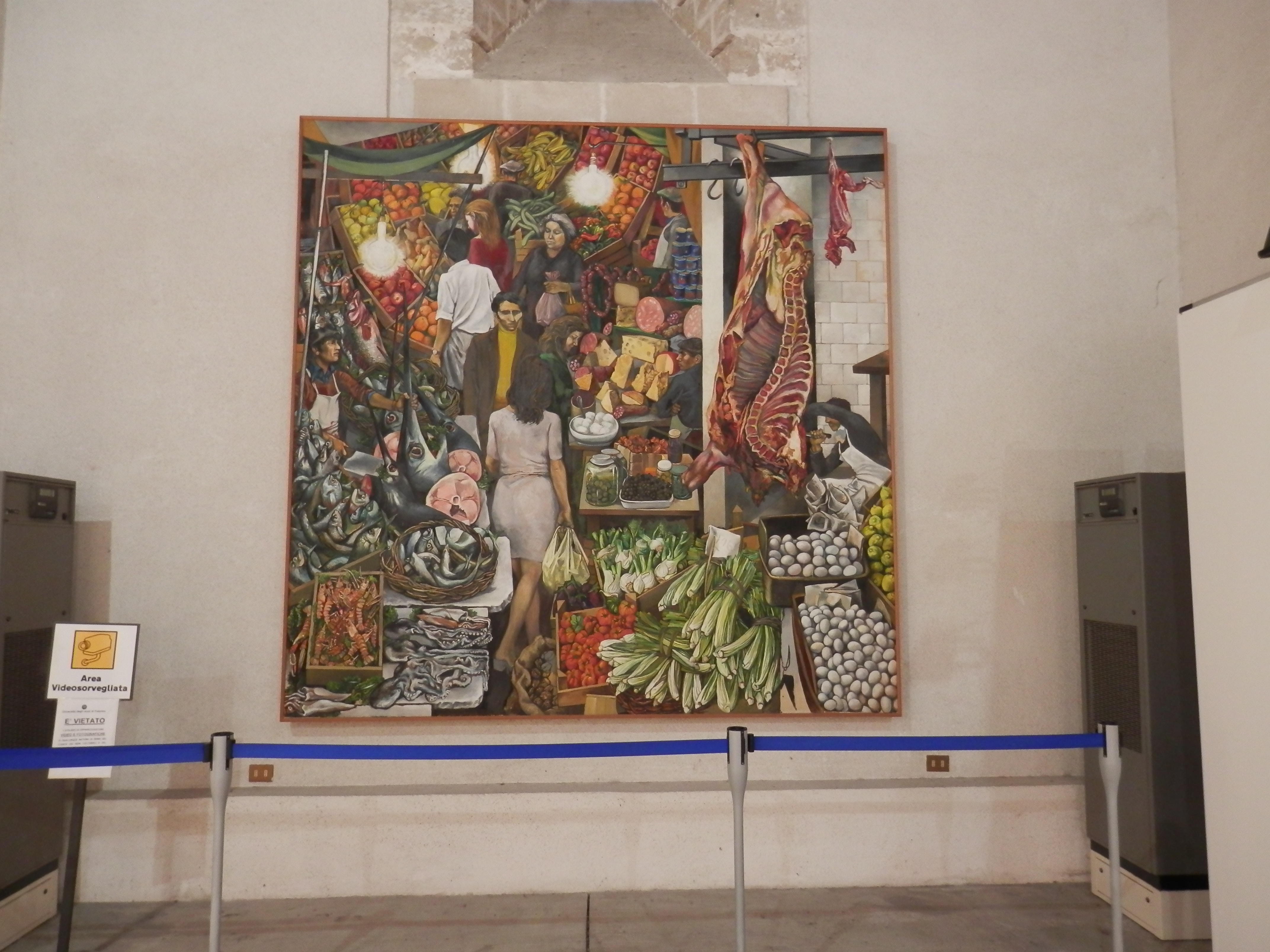 This painting is called “The Vucciria” and is by Renato Guttuso. The original – which is absolutely huge – hangs in Palazzo Steri in Palermo – at various times the former seat of the Spanish Inquisition, palace, Moorish pottery factory, community food storage warehouse, government office and prison.