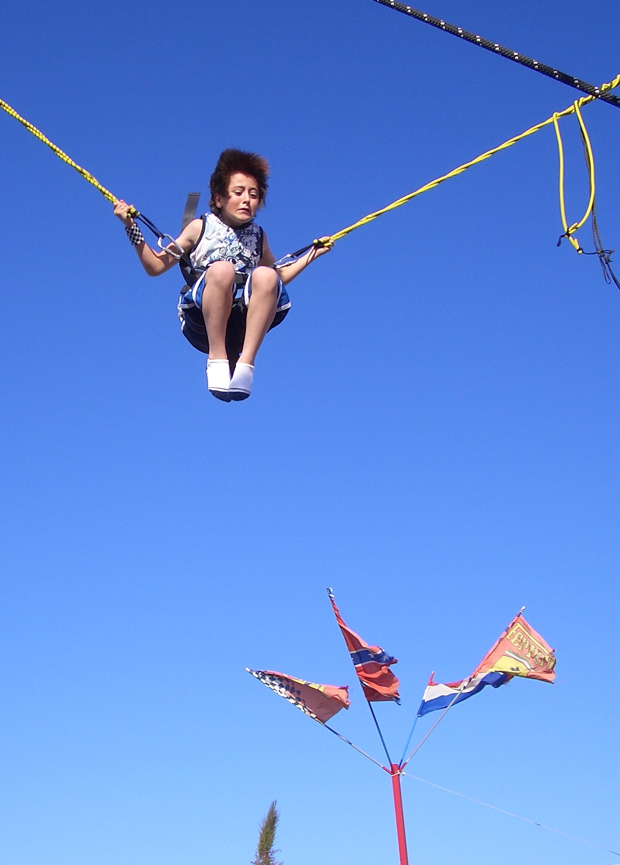 This photo was taken at an adventure park in Santa Flavia, Sicily. It sprawls alongside a busy crossroads and from every direction you can see small children flying high into the air above all the blocks of flats and exhaust fumes.